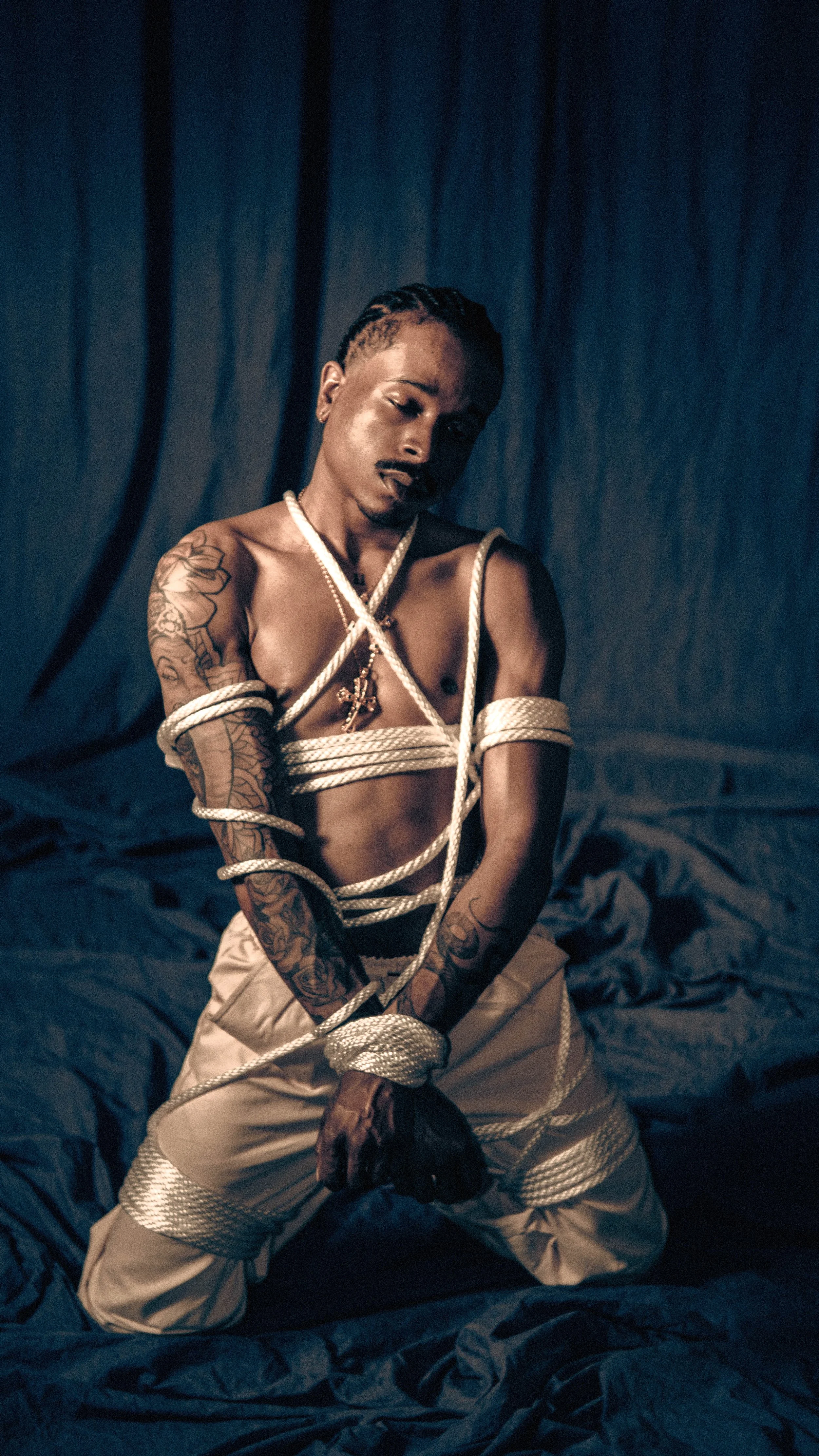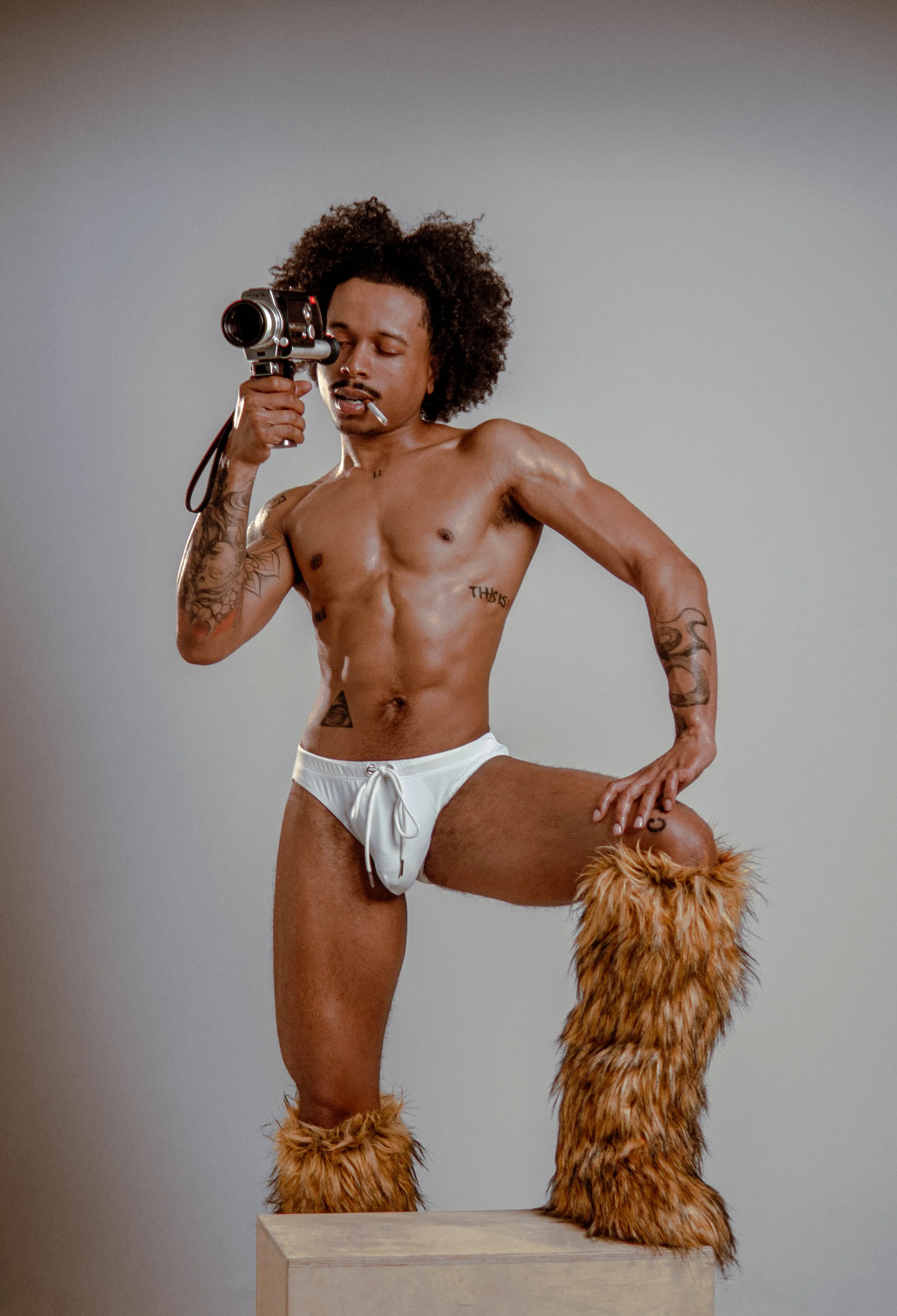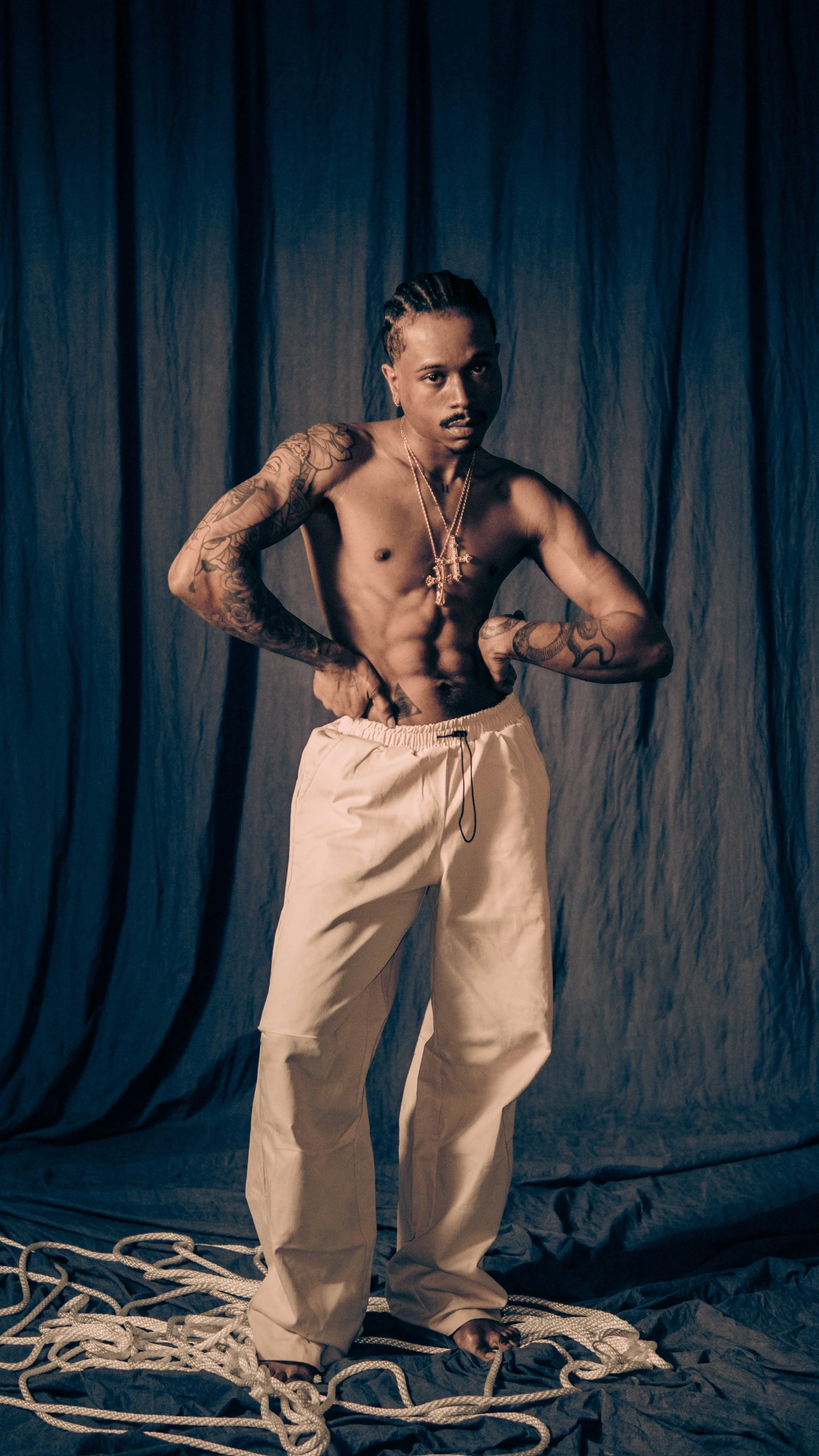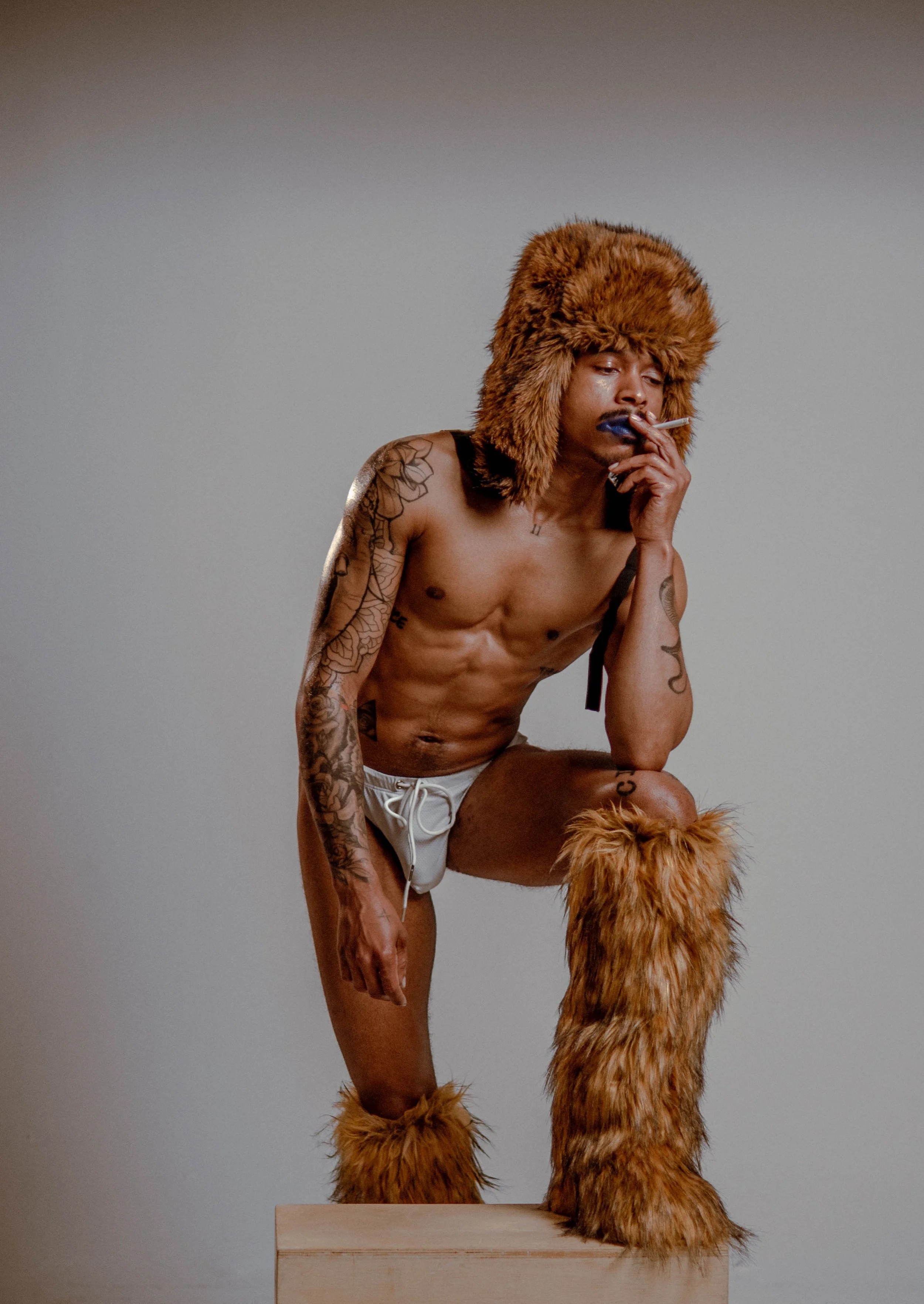 A shirtless man with dark skin wearing a large blue hat, holding a cigarette in his mouth, and looking to the side against a plain light background.
