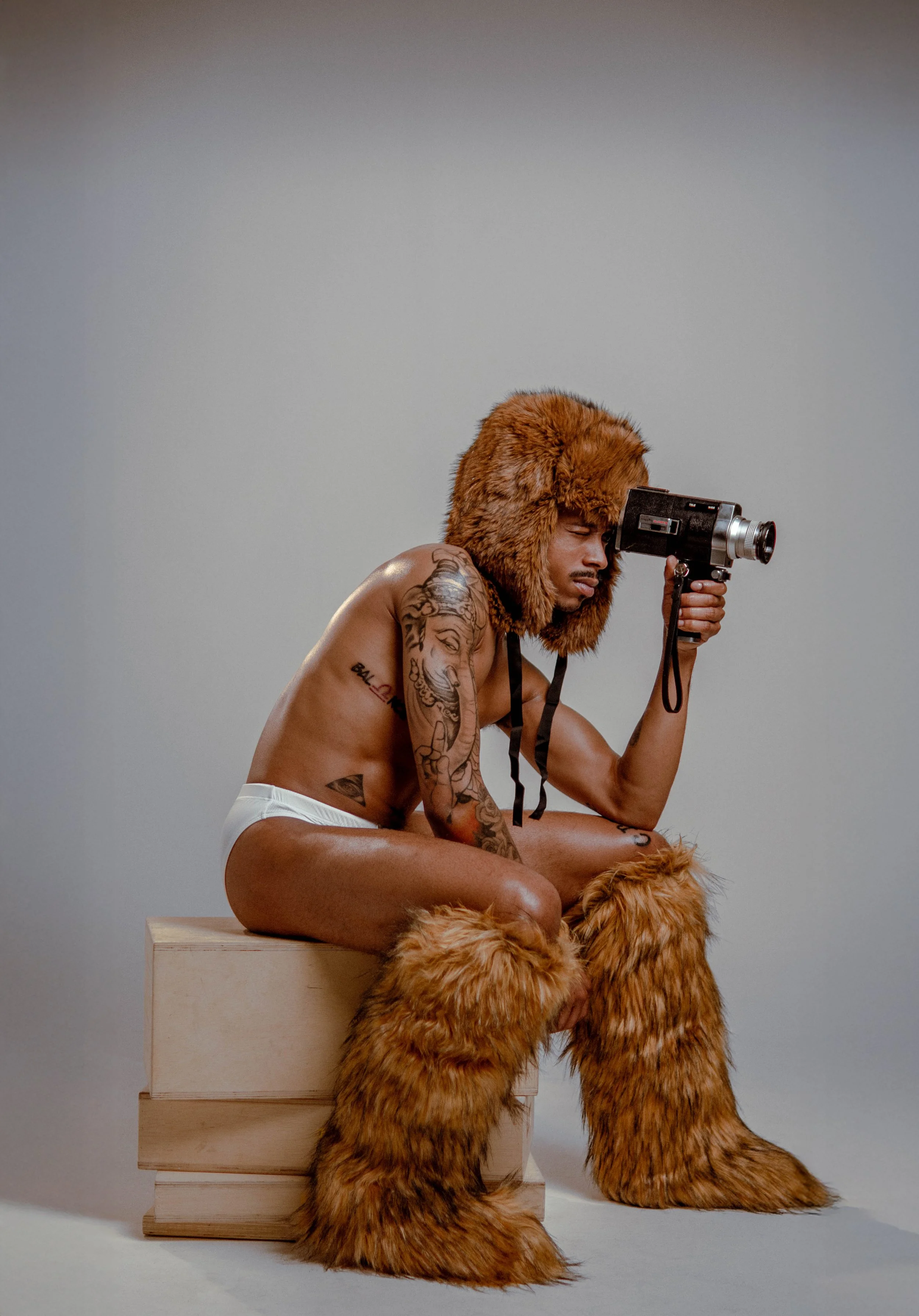 Young man sitting cross-legged on a brown fabric surface, holding a vintage camera up to his eye, with another camera resting on the fabric near his feet, against a brown gradient background.