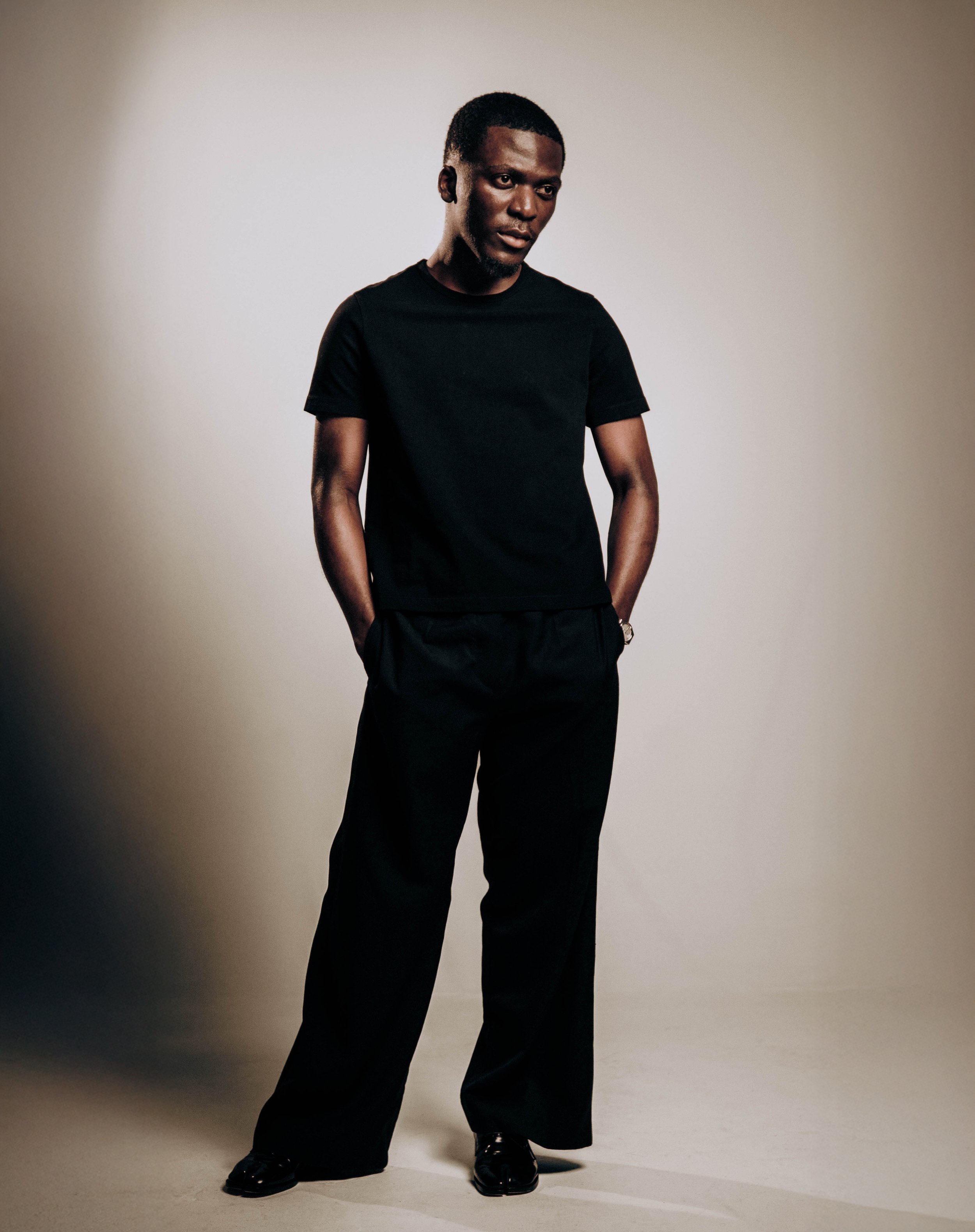 A man with dark hair and a serious expression, wearing a vintage military uniform with a white shirt unbuttoned at the top, black pants, standing with hands on hips against a dark background.