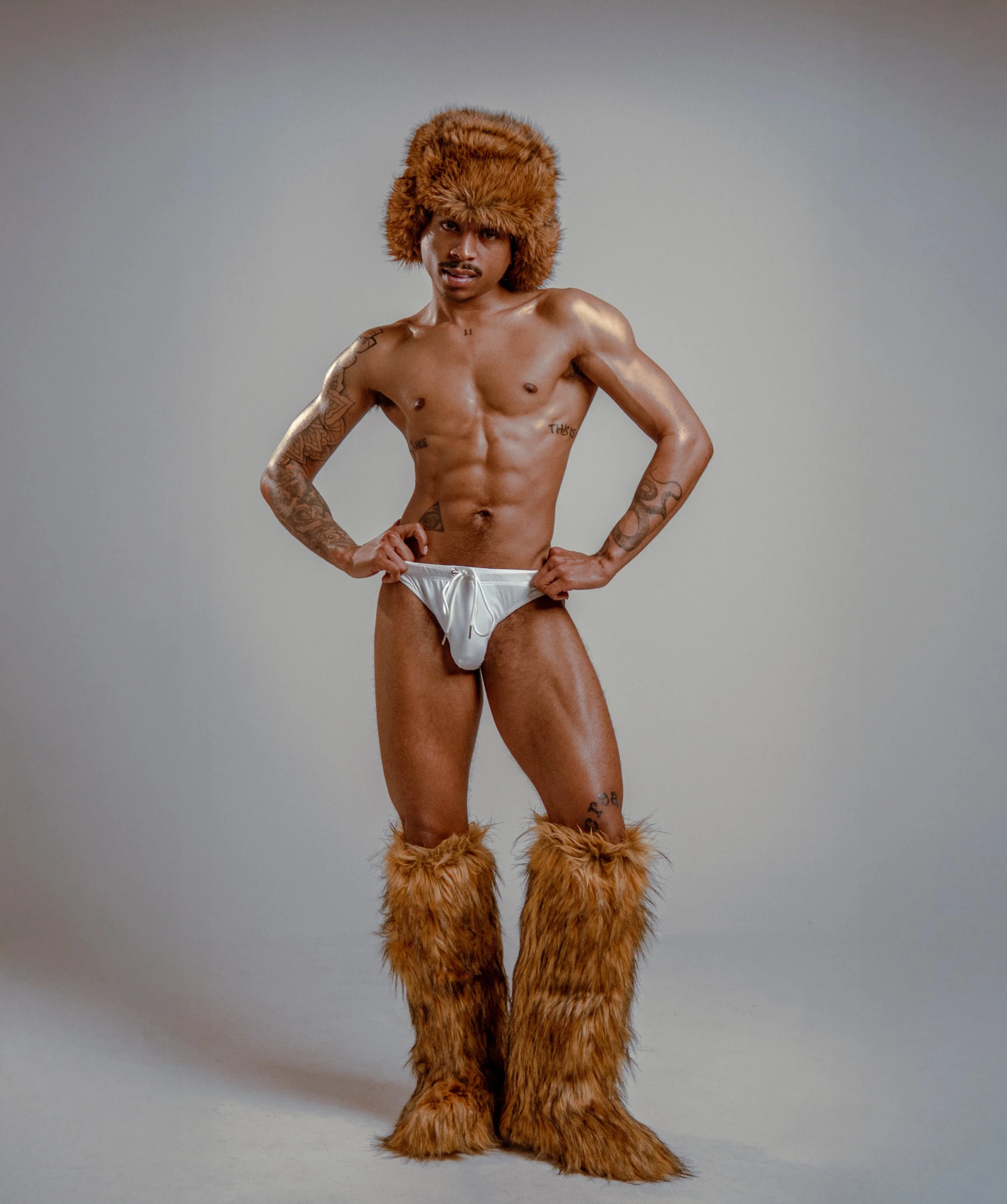 A shirtless person wearing a large blue hat and loose blue pants poses against a plain white background.